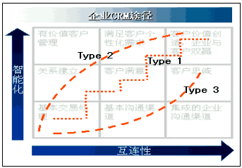 1是"小步快跑"型,Type 2是"改革優(yōu)先"型,Type 3是"技術(shù)驅(qū)動"型,如下圖所示。圖中互連性,表示企業(yè)信息化環(huán)境建設的規(guī)模,也意味著企業(yè)與客戶的交互程度,即溝通能力;縱坐標所示的智能化,代表管理思想、管理模式、知識應用和情感投入,是客戶關(guān)系管理中人性化和價值衡量的雙重體現(xiàn)。