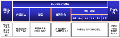 造成這樣的結(jié)果, 關(guān)鍵在于僅僅用產(chǎn)品或服務(wù), 無法表達(dá)出客戶對(duì)企業(yè)完整的價(jià)值取向. 我們還需要更豐富的管理理念來表達(dá)出企業(yè)對(duì)客戶所有的價(jià)值提供. 這一概念其實(shí)早已由埃森哲提出, 我們稱之為”Customer Offer”. 其內(nèi)涵在國內(nèi)的實(shí)際項(xiàng)目中已經(jīng)得到實(shí)踐的檢驗(yàn), 并取得良好的效果(該項(xiàng)目為某國內(nèi)領(lǐng)先的電信運(yùn)營企業(yè)的CRM項(xiàng)目, 于2003年底完成).