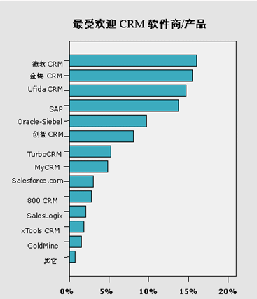 而在此類調(diào)查中一直名列前茅的國(guó)外CRM軟件商三巨頭SAP和 Oracle-Siebel(由于Siebel已被Oracle兼并,現(xiàn)以O(shè)racle-Siebel代替),在本次知名度調(diào)查中則落后于以上三家CRM軟件商。SAP和Oracle-Siebel的這一比例分別為13.80%和9.74%。