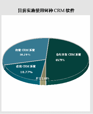 在選擇“已經(jīng)實(shí)施任一CRM軟件”的38.45%的被調(diào)查者中,有48.79%的CRM軟件使用者目前實(shí)施的是“自行開發(fā)CRM系統(tǒng)”,而選擇“傳統(tǒng)CRM系統(tǒng)”的為30.29%。雖然市場(chǎng)對(duì)on-demand