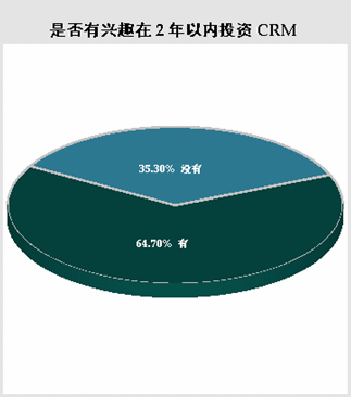 在選擇“尚未使用任一CRM軟件”的被調(diào)查者中,當(dāng)被問(wèn)及基于現(xiàn)在的狀況,“是否有興趣在兩年以內(nèi)投資CRM”。有64.70%的被調(diào)查者選擇有興趣在兩年內(nèi)投資CRM軟件,而選擇沒有興趣在兩年內(nèi)投資CRM軟件的只占35.30%。盡管現(xiàn)在實(shí)際使用CRM軟件的用戶所占比例還不甚理想,但市場(chǎng)前景還是非?春,大部分公司具有實(shí)施CRM軟件的需求。