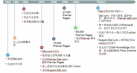 在1997年,Dell開(kāi)始提供一項(xiàng)稱(chēng)為“我的Dell”的服務(wù)項(xiàng)目。任何顧客都可以在Dell網(wǎng)站上建立一個(gè)屬于自己的定制化網(wǎng)頁(yè)。顧客可以選擇希望出現(xiàn)在這個(gè)頁(yè)面上的個(gè)人化信息。對(duì)于公司的投資者(或者大的客戶(hù)),如果希望獲得公司最新宣布的產(chǎn)品的相關(guān)信息以及市場(chǎng)擴(kuò)展情況,可以選擇在自己的“我的Dell”網(wǎng)頁(yè)上觀看最新發(fā)布的消息和投資信息。Dell提供全面定制化并有密碼保護(hù)的網(wǎng)上站點(diǎn)——Premier Page,通過(guò)使用該站點(diǎn)提供的程序,客戶(hù)可以將Dell網(wǎng)站的一部分引入客戶(hù)自己的企業(yè)網(wǎng),使客戶(hù)獲得一連串的消費(fèi)服務(wù)。到了Dell 2006財(cái)政年度的結(jié)束時(shí),公司在世界各地已經(jīng)建立了超過(guò)十萬(wàn)個(gè)Premier Page互聯(lián)網(wǎng)站點(diǎn)。 Premier Page的發(fā)展歷程如下: