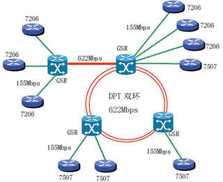Switch Router 12000), 其中三個GSR之間采用Cisco的動態(tài)IP光纖傳輸技術DPT,采用兩個STM-4光纖環(huán)連接,利用SRP技術,使得STM-4在兩個環(huán)上實現(xiàn)負載均衡,這樣,主干網(wǎng)絡連接可以實現(xiàn)自我冗余保護,保證網(wǎng)絡主干連接在其中一條出現(xiàn)故障時,另外一條可以在很短的時間內(nèi)(<50ms)接管數(shù)據(jù)負載。另一個GSR與DPT環(huán)之間采用STM-4的POS接口相連接。