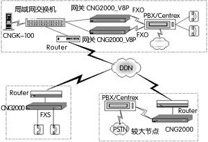 根據(jù)實(shí)際的話務(wù)量和人員數(shù)量,選用FXO接口2-8路語音的CNG2000 IP語音網(wǎng)關(guān)1臺(tái)。可以選用PBX應(yīng)用方式或向電信公司申請(qǐng)Centrex業(yè)務(wù)。