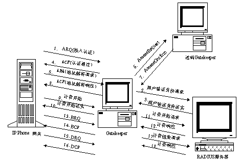 2、用戶認(rèn)證:網(wǎng)關(guān)用ARQ把用戶卡號和密碼發(fā)給網(wǎng)守,網(wǎng)守再把卡號和密碼送給計費認(rèn)證中心,如果計費認(rèn)證中心認(rèn)證通過,網(wǎng)守向網(wǎng)關(guān)發(fā)ACF,否則回ARJ。
