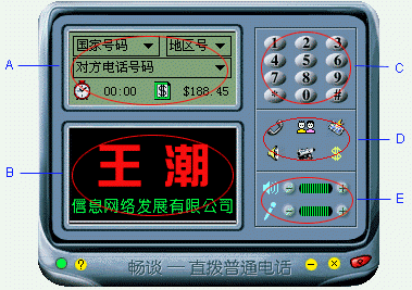 。ㄈ鐖D1)“王潮暢談?wù)Z音全球通”的主界面。A部分是虛擬液晶顯示屏,這里顯示的內(nèi)容與 D(功能鍵區(qū))相對(duì)應(yīng),B是廣告位,如果有興趣可以與王潮公司聯(lián)系作廣告(^_^),C是撥號(hào)區(qū),D是功能按鈕區(qū),集中了這個(gè)軟件的主要功能,E是音量調(diào)節(jié)區(qū)。整個(gè)界面簡(jiǎn)潔合理。