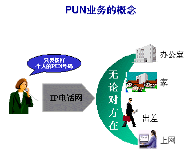 PUN業(yè)務(wù)首先給注冊(cè)用戶(hù)分配一個(gè)號(hào)碼,此號(hào)碼根據(jù)運(yùn)營(yíng)商所申請(qǐng)到的網(wǎng)號(hào)及用戶(hù)規(guī)模來(lái)規(guī)劃,如181XXXXXXX,申請(qǐng)到該號(hào)碼后,用戶(hù)可以通過(guò)各種方便的方式(如上網(wǎng)、打電話(huà))等將此號(hào)碼綁定到任一特定終端,如家庭電話(huà),移動(dòng)手機(jī)等,綁定以后,任何人在任何地點(diǎn)都可以通過(guò)拔打此號(hào)碼,PUN系統(tǒng)將會(huì)根據(jù)用戶(hù)的設(shè)置,將此呼叫經(jīng)IP網(wǎng)絡(luò)送至對(duì)應(yīng)的終端,從而完成呼叫,PUN用戶(hù)還可以設(shè)置繁雜的規(guī)劃,如當(dāng)手機(jī)關(guān)機(jī)時(shí),將呼叫送至某一固定電話(huà),或在用戶(hù)上網(wǎng)時(shí),首選PC機(jī)作為呼叫終端,也可以根據(jù)時(shí)間段來(lái)靈活設(shè)置終端,其設(shè)置方法也比傳統(tǒng)的呼叫轉(zhuǎn)移更加方便和靈活。其圖一: