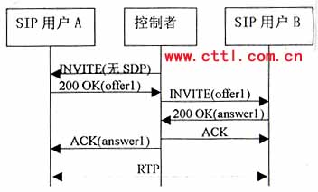本流程中,控制者向A發(fā)送一個沒有SDP的INVITE。A應(yīng)答的200 OK響應(yīng)中包含一個offerl,控制者立即在ACK消息中產(chǎn)生一個“黑洞”SDP應(yīng)答。