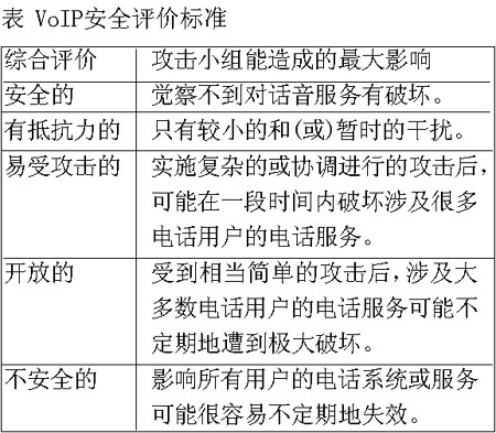 測試結(jié)果表明,采用了復雜攻擊手段的攻擊小組無法破壞思科公司的VoIP網(wǎng)絡,甚至無法對其造成顯著的干擾。這套精心制造的IP電話系統(tǒng)(包括第二層和第三層基礎(chǔ)設施以及各式各樣的附加安全軟件)是“安全的”(參見表中所示的VoIP安全評價標準),它最大限度地全面發(fā)揮了思科公司的網(wǎng)絡安全專長,利用了思科公司擁有的每一種防御武器。