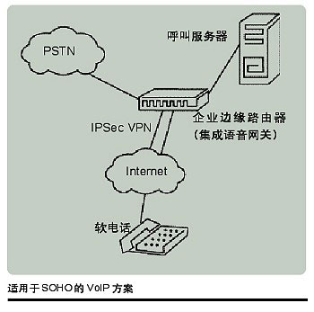 。。通常,為了安全性的考慮,SOHO用戶會(huì)通過(guò)企業(yè)數(shù)據(jù)網(wǎng)絡(luò)的IPsec VPN連接來(lái)訪問(wèn)企業(yè)內(nèi)部的呼叫控制服務(wù)器。被叫方為企業(yè)內(nèi)部的呼叫通過(guò)IPsec VPN轉(zhuǎn)到內(nèi)部網(wǎng)絡(luò),被叫方為企業(yè)外部的呼叫則轉(zhuǎn)到PSTN網(wǎng)絡(luò)。大多數(shù)情況下,呼叫控制服務(wù)器都是布置于企業(yè)總部或大型分支站點(diǎn),但近來(lái)的一個(gè)趨勢(shì)是企業(yè)可以選擇將此類服務(wù)外包給運(yùn)營(yíng)商。