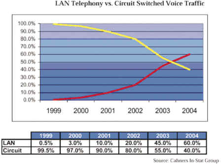 Group的資料顯示,LAN Telephone與Circuit Switched Voice Traffic比較圖,呈現(xiàn)數(shù)據(jù)網(wǎng)絡(luò)的占有率將在二至三年后,首度超越語(yǔ)音網(wǎng)絡(luò)的流量占有率。因此,不論是盤據(jù)傳統(tǒng)電信市場(chǎng)大廠如Lucent及Nortel,或是代表網(wǎng)絡(luò)新興勢(shì)力的Cisco,也都在積極爭(zhēng)搶這塊新領(lǐng)域的主導(dǎo)權(quán)。于是,有人說,「IP