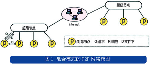 Skype是P2P技術(shù)演進到混合模式后的典型應(yīng)用,它結(jié)合了集中式和分布式的特點,在網(wǎng)絡(luò)的邊緣節(jié)點采用集中式的網(wǎng)絡(luò)結(jié)構(gòu),而在超級節(jié)點之間采用分布式的網(wǎng)絡(luò)結(jié)構(gòu),混合模式的P2P網(wǎng)絡(luò)模型如圖1所示。