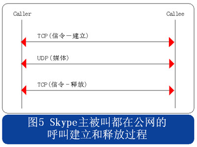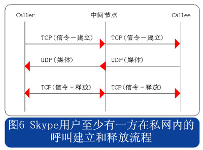 查找到希望連接的用戶后,可以將其加入好友列表,Skype用戶可以隨時與在線的好友進行呼叫。經(jīng)過了稍微復(fù)雜的認證過程和用戶查找過程,呼叫建立和釋放的過程就變得簡單了。用戶位于公網(wǎng)和位于私網(wǎng)內(nèi)部的情況會有所不同,兩種情況下的呼叫建立和釋放流程分別見圖5和圖6所示。