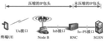 HSPA的包頭壓縮在終端UE和無(wú)線網(wǎng)絡(luò)控制器(RNC)的第二層分組數(shù)據(jù)匯聚協(xié)議(PDCP)中進(jìn)行,因此這種壓縮方式不僅能節(jié)省空中接口的容量,還能節(jié)省Iub接口上的傳輸容量。數(shù)據(jù)包頭的壓縮位置如圖1所示。