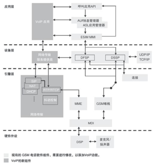 藍色方塊表示現(xiàn)有平臺的新應(yīng)用,包括網(wǎng)絡(luò)傳輸協(xié)議、核心控制VoIP應(yīng)用。由于支持GPRS功能的每部移動電話都應(yīng)該帶有TCP/UDP