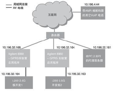 8960 ,將GRPS實驗室應(yīng)用測試集用作媒介,將 i.250 2.5G 開發(fā)板卡 (ADS板卡)連接到互聯(lián)網(wǎng)。ADS板卡在接通電源時,注冊登錄到GPRS網(wǎng)絡(luò),測試集然后通過路由器連接到互聯(lián)網(wǎng)。測試集充當(dāng)連接到GPRS的DUT的橋梁,讓它們接入互聯(lián)網(wǎng)。一旦GPRS上下文激活,測試集將為ADS分配一個固定IP地址。此外,在PC上運行的代理服務(wù)器也連接到同一個路由器。通過這種安排,確保三個實體都能在同一網(wǎng)段內(nèi)運行。這樣就能對同一個網(wǎng)段內(nèi)的分組流量進行監(jiān)控,用于開發(fā)目的。