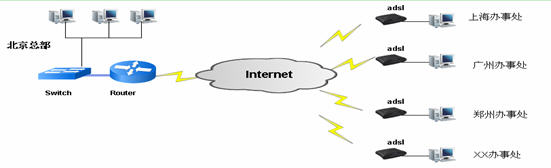 數(shù)據網絡:各地辦事處通過ADSL接入Internet,構建在Internet上與總部互通的寬帶網絡。