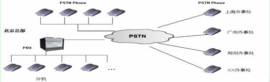 語音網絡:總部部署有小型PBX,同時擁有部分直線PSTN電話,辦事處直接使用直線PSTN電話。