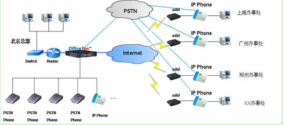 在辦事處ADSL后部署IP Phone,使IP Phone同時具有IP分機和直線PSTN話機的功能,同時利用IP