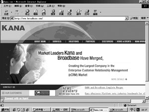 Kana是美國在線服務(wù)領(lǐng)域的知名公司,其eCRM軟件在客戶關(guān)系管理領(lǐng)域極具代表性。Kana公司剛開始只提供電子郵件響應管理技術(shù),但是通過一系列的收購舉措,Kana已經(jīng)可以提供端到端的客戶服務(wù)解決方案。最近,Kana并購了美國Broadbase公司,成為在線客戶服務(wù)領(lǐng)域的“巨頭”。該公司的旗艦級產(chǎn)品主要是針對Email回復的客戶服務(wù)系統(tǒng),Kana的Email客戶服務(wù)軟件被Yahoo!和AOL等著名的網(wǎng)絡(luò)公司采用。