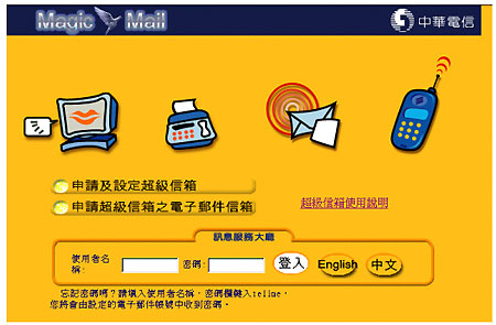 使用Internet瀏覽器的用戶可以通過中華電信超級(jí)信箱的專用網(wǎng)頁來接入。當(dāng)然,您需要輸入使用名和密碼。