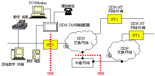 NT1:網(wǎng)絡(luò)終端1,標(biāo)志本地環(huán)路的物理終結(jié),具有用戶傳輸線終端和用戶網(wǎng)絡(luò)接口(UNI)功能;