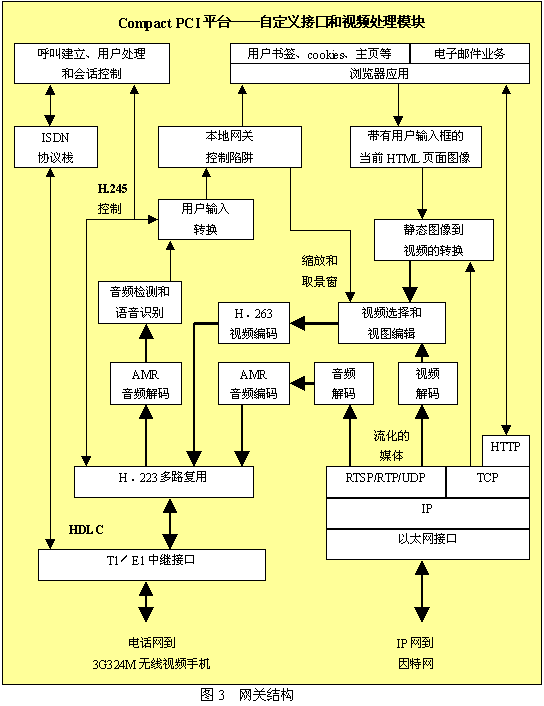 圖3所示為網(wǎng)關(guān)重要組成的分解圖。網(wǎng)關(guān)機(jī)箱很可能是一個(gè)Compact PCI機(jī)箱,機(jī)箱中包含了作為網(wǎng)絡(luò)中一個(gè)節(jié)點(diǎn)的所有組件。基本的視頻呼叫和瀏覽器應(yīng)用可以運(yùn)行在主處理器上,但T1或E1接口需要由附加模塊來支持。為了支持大量的端口,還需要附加的以太網(wǎng)接口和自定義的視頻處理模塊。T1/E1接口通過公共電話網(wǎng)接入無線交換中心,也可以直接接入到無線交換中心。以太網(wǎng)接口會(huì)通過標(biāo)準(zhǔn)IP路由器接入到因特網(wǎng)。