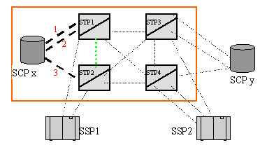 圖中紅色框內(nèi)的網(wǎng)絡(luò)包括SCPx,STP1和STP2三個(gè)信令點(diǎn)。鏈路1和2構(gòu)成SCPx和STP1之間的鏈路集。鏈路3構(gòu)成SCPx和STP2之間的鏈路集。