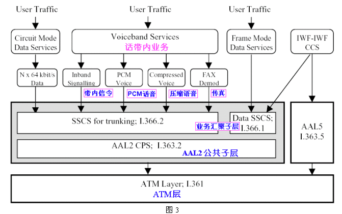 話帶業(yè)務(wù)包括標(biāo)準(zhǔn)PCM、壓縮語(yǔ)音和FAX等。它們?cè)贏TM網(wǎng)絡(luò)的傳輸主要有兩種方式:LES和VoIP/AAL5/ATM。