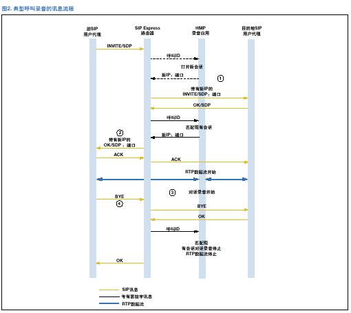 圖2是"代理RTP"在線錄音系統(tǒng)典型呼叫錄音的訊息流程圖解。圖中數字對應于下文的段落編號。