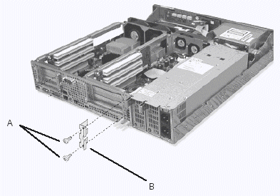 1. 卸下機(jī)箱后部用來固定PCI擋板支架的兩顆螺絲釘(參見圖5-6中A);