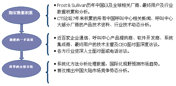 Frost & Sullivan 和 CTI論壇(m.efortunetech.com)共同組成的調(diào)研小組,在查閱了大量資料的基礎(chǔ)之上,以企業(yè)通信及呼叫中心的設(shè)備應(yīng)用、投資計(jì)劃以及相關(guān)廠商的市場(chǎng)表現(xiàn)為出發(fā)點(diǎn),通過(guò)對(duì)企業(yè)通信及呼叫中心重要應(yīng)用企業(yè)、在市場(chǎng)占主導(dǎo)地位的二十多家設(shè)備廠商、二十多家軟件開發(fā)商、十幾家系統(tǒng)集成商、數(shù)家外包運(yùn)營(yíng)商的深度訪談,參閱內(nèi)部相關(guān)報(bào)告及數(shù)據(jù)庫(kù),對(duì)數(shù)據(jù)的來(lái)源和數(shù)據(jù)的準(zhǔn)確性進(jìn)行了詳細(xì)核對(duì)與論證;憑借參與調(diào)研人員的多年從業(yè)經(jīng)